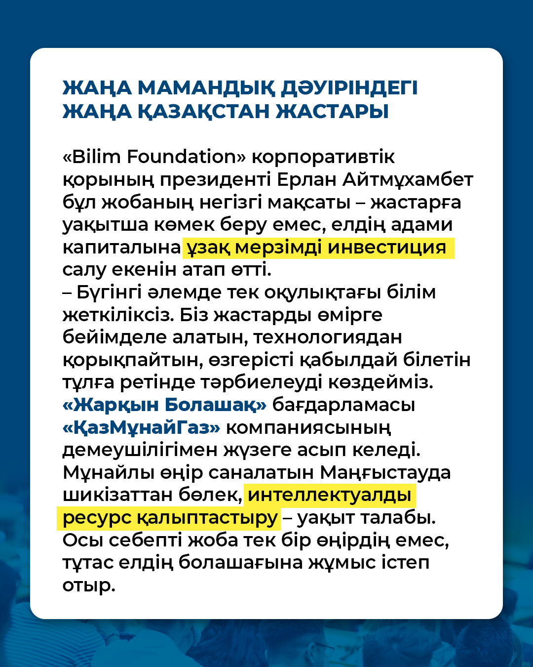 «Bilim Foundation» корпоративтік қорының президенті Ерлан Айтмұхамбет «Жарқын Болашақ» бағдарламасының негізгі мақсаты – жастарға уақытша көмек беру емес, елдің адами капиталына ұзақмерзімді инвестиция салу екенін атап өтті.
